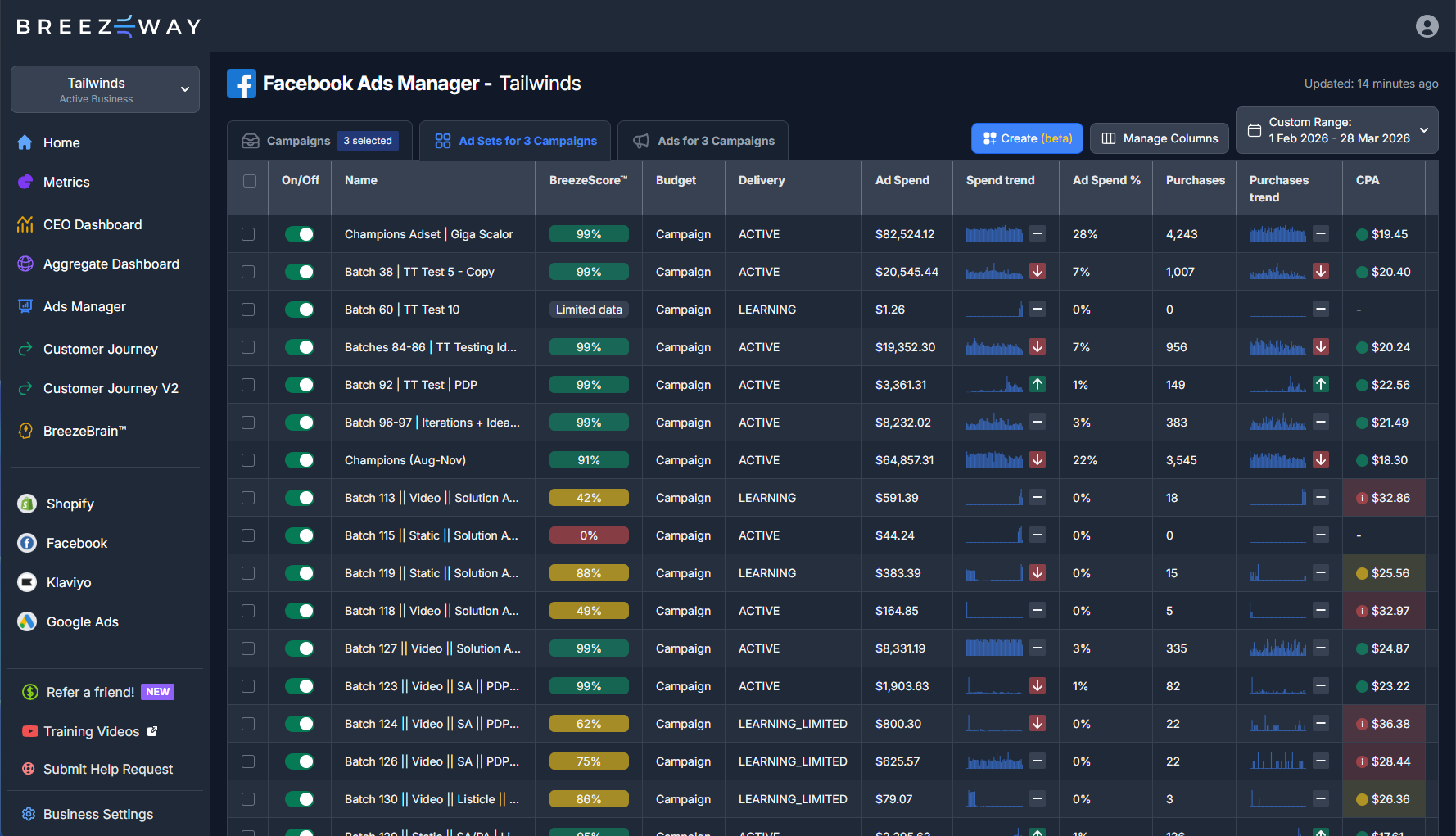 Breezeway strips out the settings you'll never touch and defaults the ones you always should. Your creative is front and center. The technical bloat is gone. Bulk editing that actually works. Creative-first structure that mirrors how you actually think.
